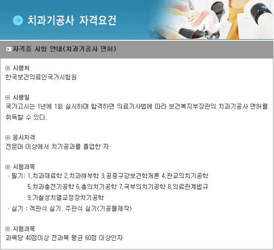 ½ÃÇèÀº ½Ç±â¿Í Çʱâ·Î ³ª´©¾î¼ ½Ç½ÃµÇ¸ç Çʱâ½ÃÇèÀº ÀÇ·á°ü°è¹ý±Ô, °øÁß±¸°º¸°ÇÇа³·Ð, ±¸°ÇغÎÇа³·Ð, Ä¡°úÀç·áÇÐ,°¡Ã¶¼ºÄ¡¿±³Á¤ÀåÄ¡±â°øÇÐ, °ü±³ÀÇÄ¡±â°øÇÐ, Ä¡°úÃæÀü±â°øÇÐ, ÃÑÀÇÄ¡±â°øÇÐ, ±¹ºÎÀÇÄ¡±â°øÇÐÀÌ¸ç ½Ç±â½ÃÇèÀº °´°ü½Ä ½Ç±â¿Í ÁÖ°ü½Ä ½Ç±â(Ä¡°ú±â°ø¹° Á¦ÀÛ)·Î ³ª´©¾î ½Ç½ÃµÈ´Ù. ÇհݱâÁØÀº °ú¸ñ´ç 40Á¡ÀÌ»óÀ̸ç Àü°ú¸ñ Æò±Õ 60Á¡ ÀÌ»óÀ̸é ÇÕ°ÝÀÌ µÈ´Ù.